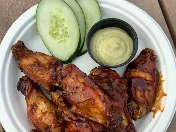 We made a reservation on the rooftop for the first Friday of the fall season and it was perfect! Since happy hour food is kind of our thing, we decided to try out their $4 truffle fries and $6 wings. They had an array of sauces so we had to try a few (c’mon it was only $6). We went with the bourbon BBQ and hot miso flavors. They were both very distinct, so we were glad we opted for two. The bourbon BBQ was the classic wing flavor and the hot miso had a spicy, Asian kick to it. As an added bonus, the wings are gluten free and to accommodate everyone they also have vegan wings available. We also have to sincerely apologize because the truffle fries were so excellently seasoned and drizzled in honey that we literally ate them all before even remembering to take a picture of the masterpiece. Pictured to the right is just one of our orders of wings (bourbon BBQ).